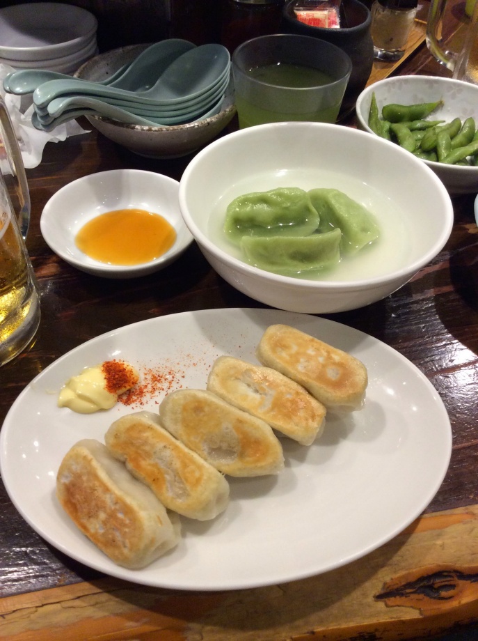 焼き餃子と水餃子のセット、もちろん餃子には生ビール!